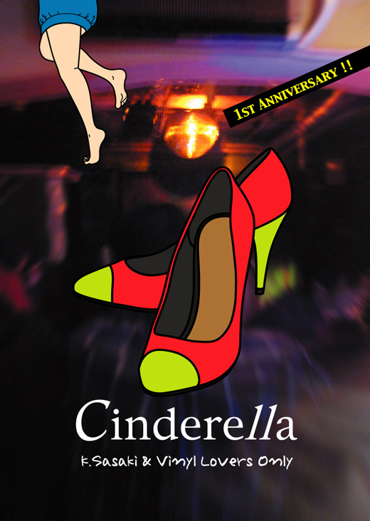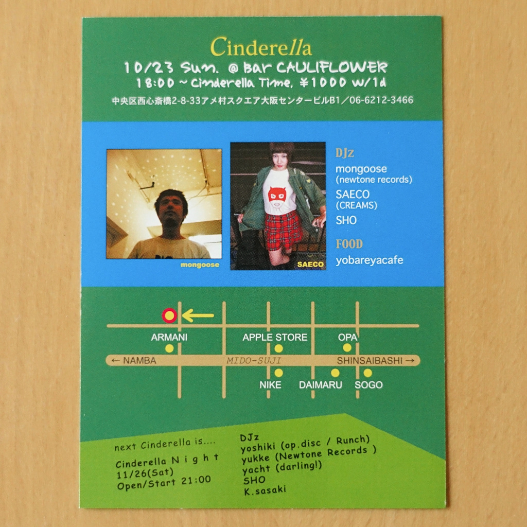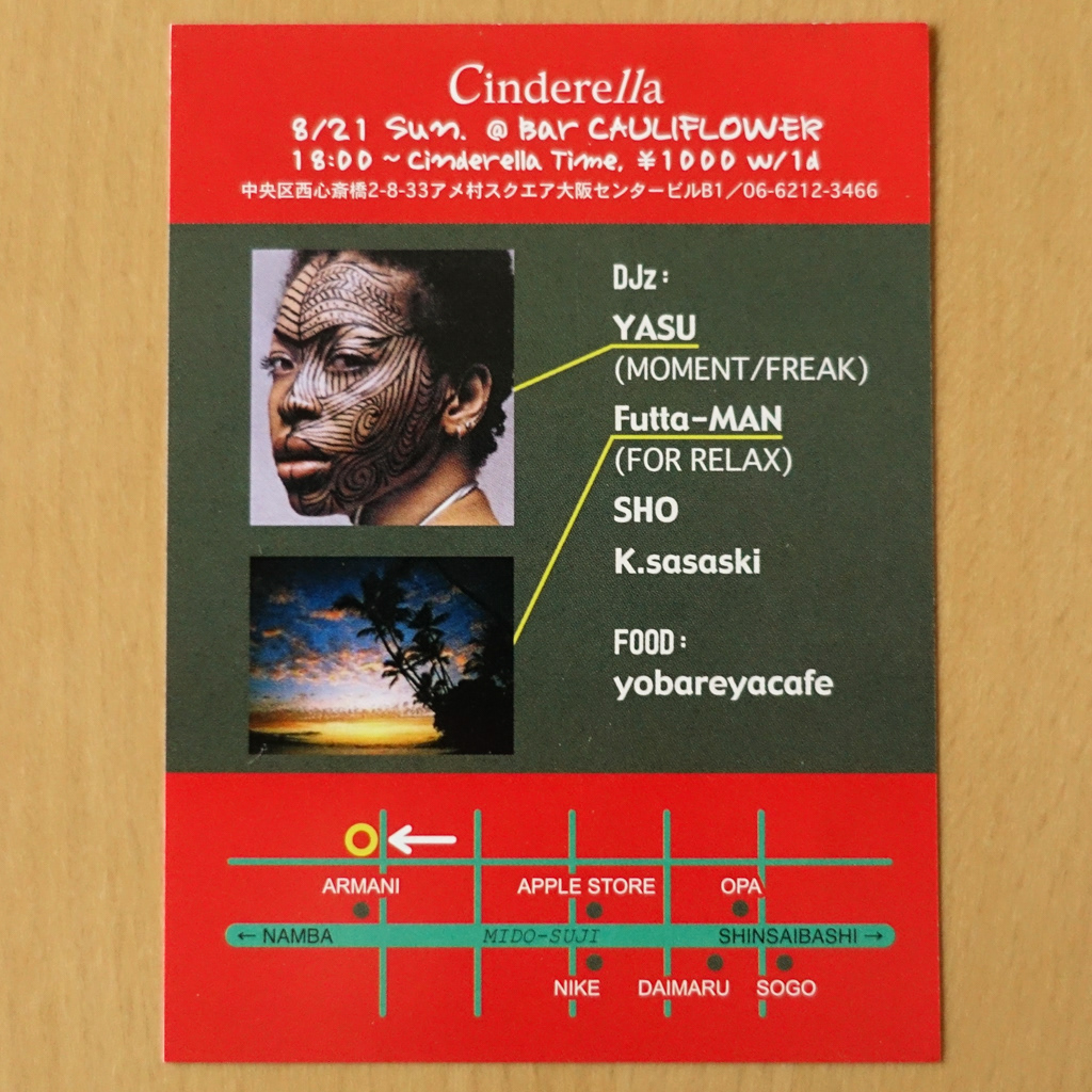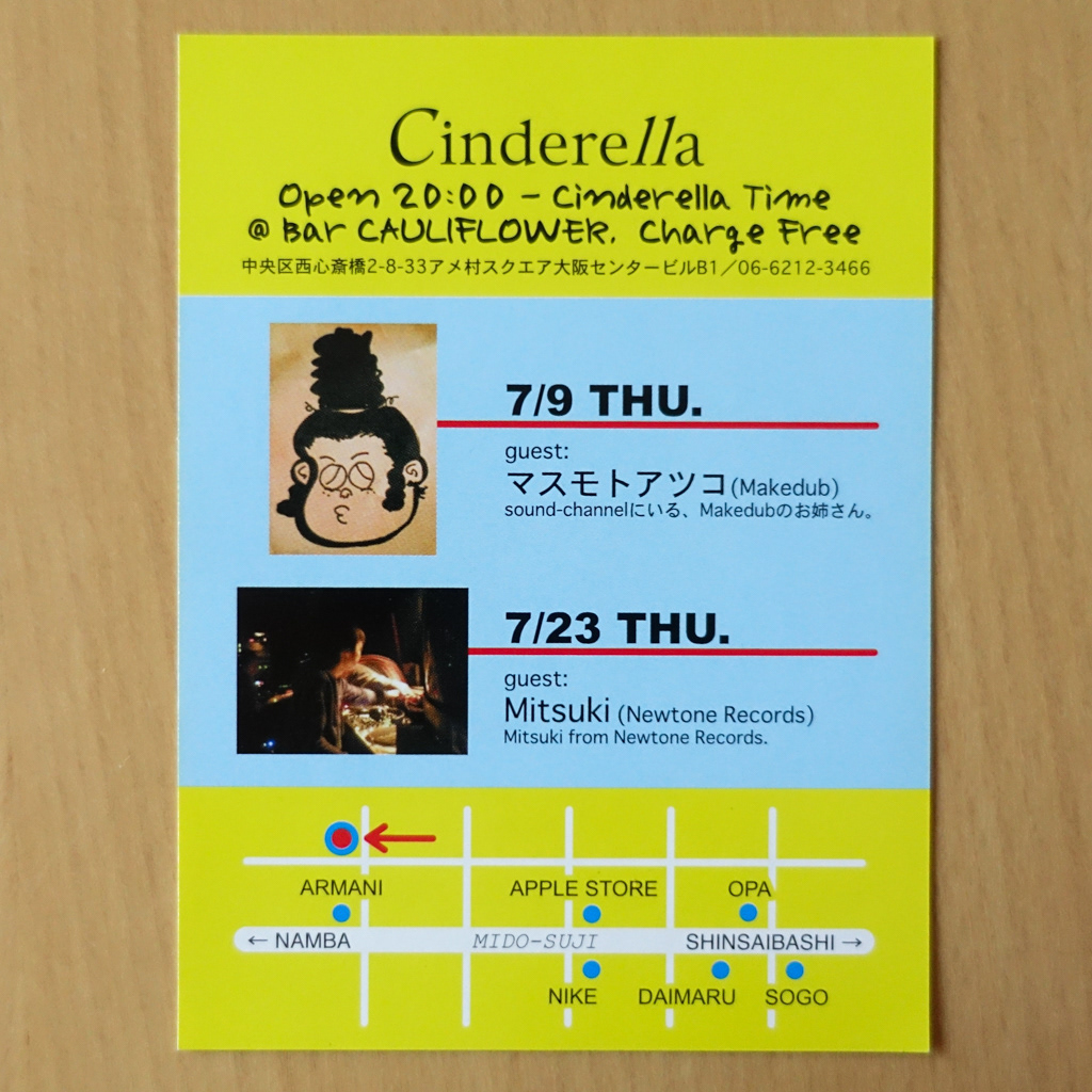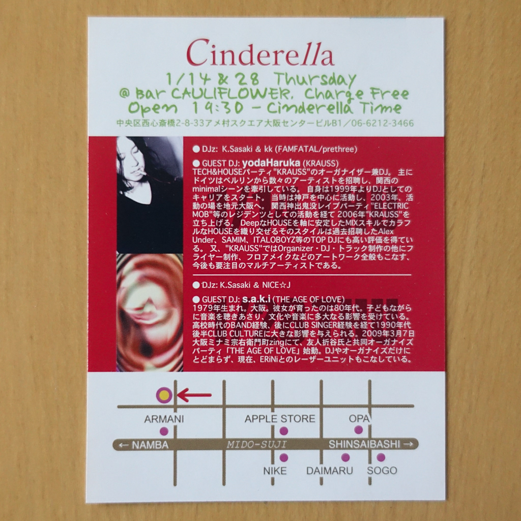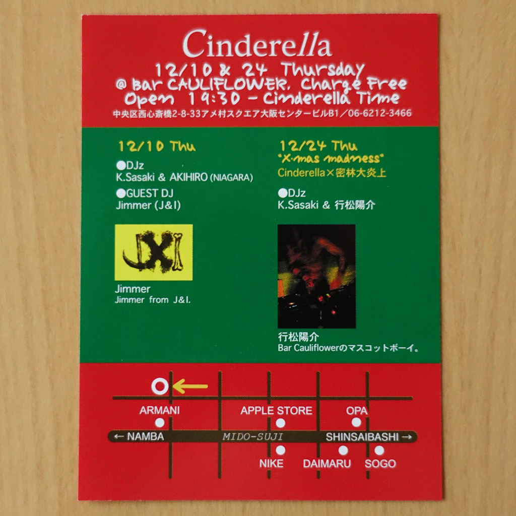 大阪・心斎橋のDJバー「Cauliflower」にて毎月開催されていたパーティ「Cinderella」のフライヤー。