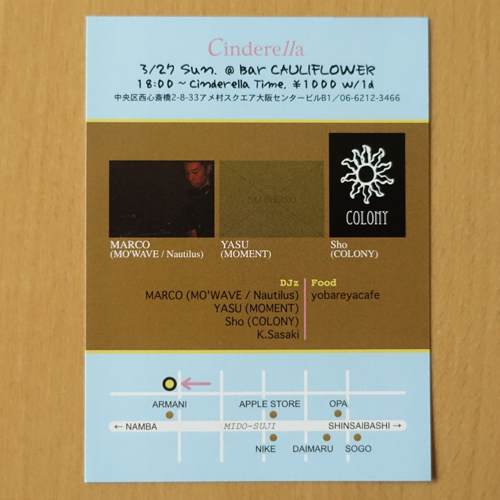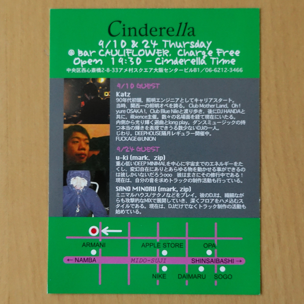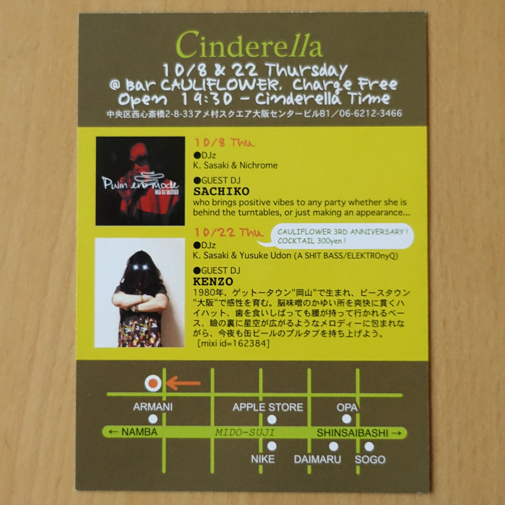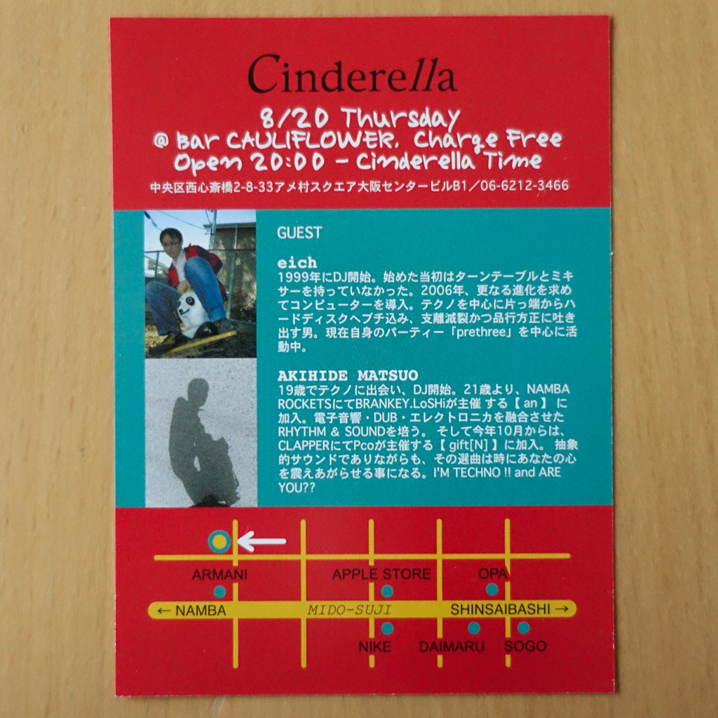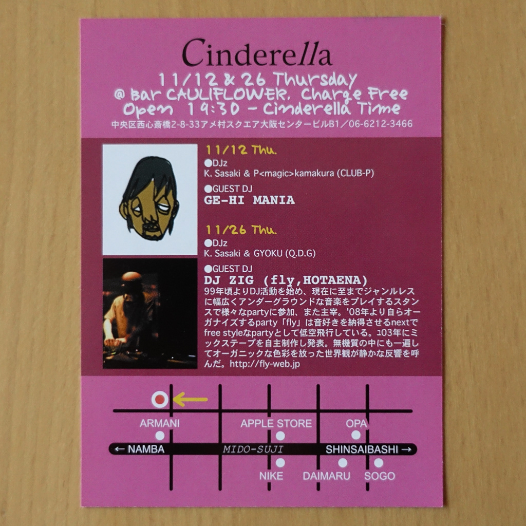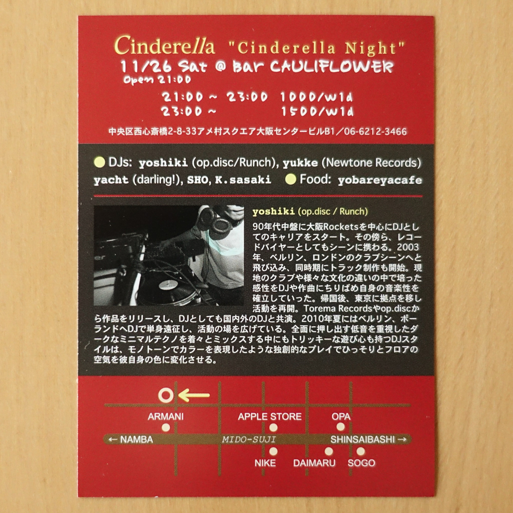 大阪・心斎橋のDJバー「Cauliflower」にて毎月開催されていたパーティ「Cinderella」のフライヤー。