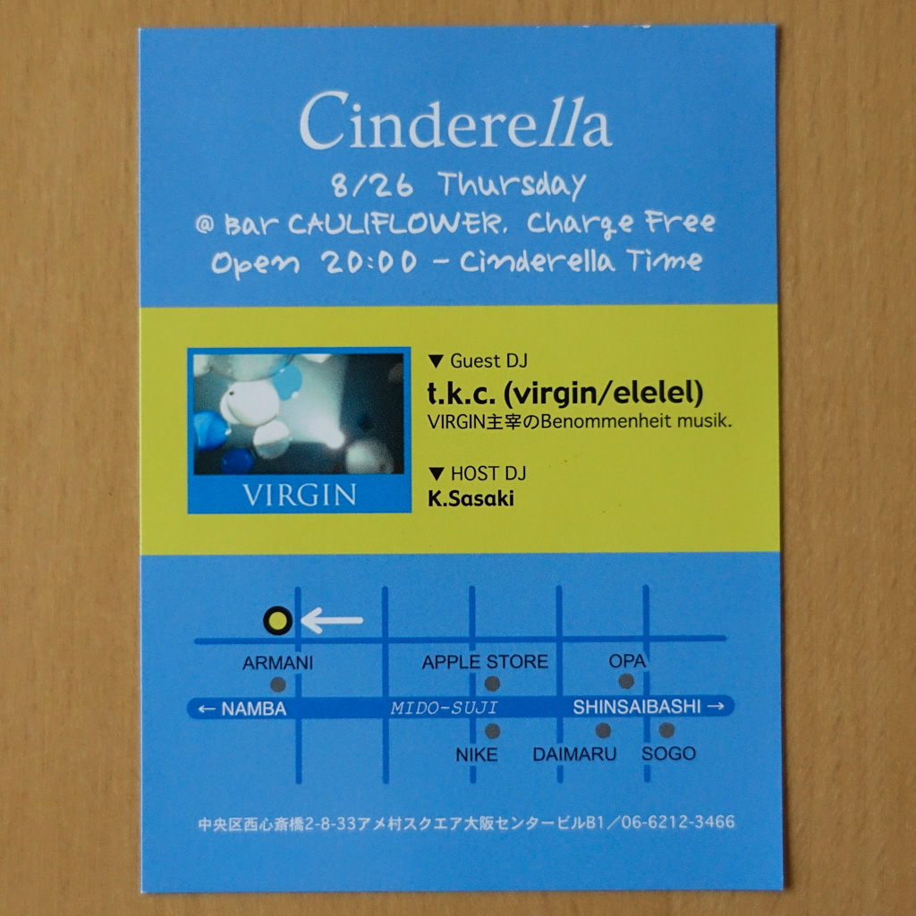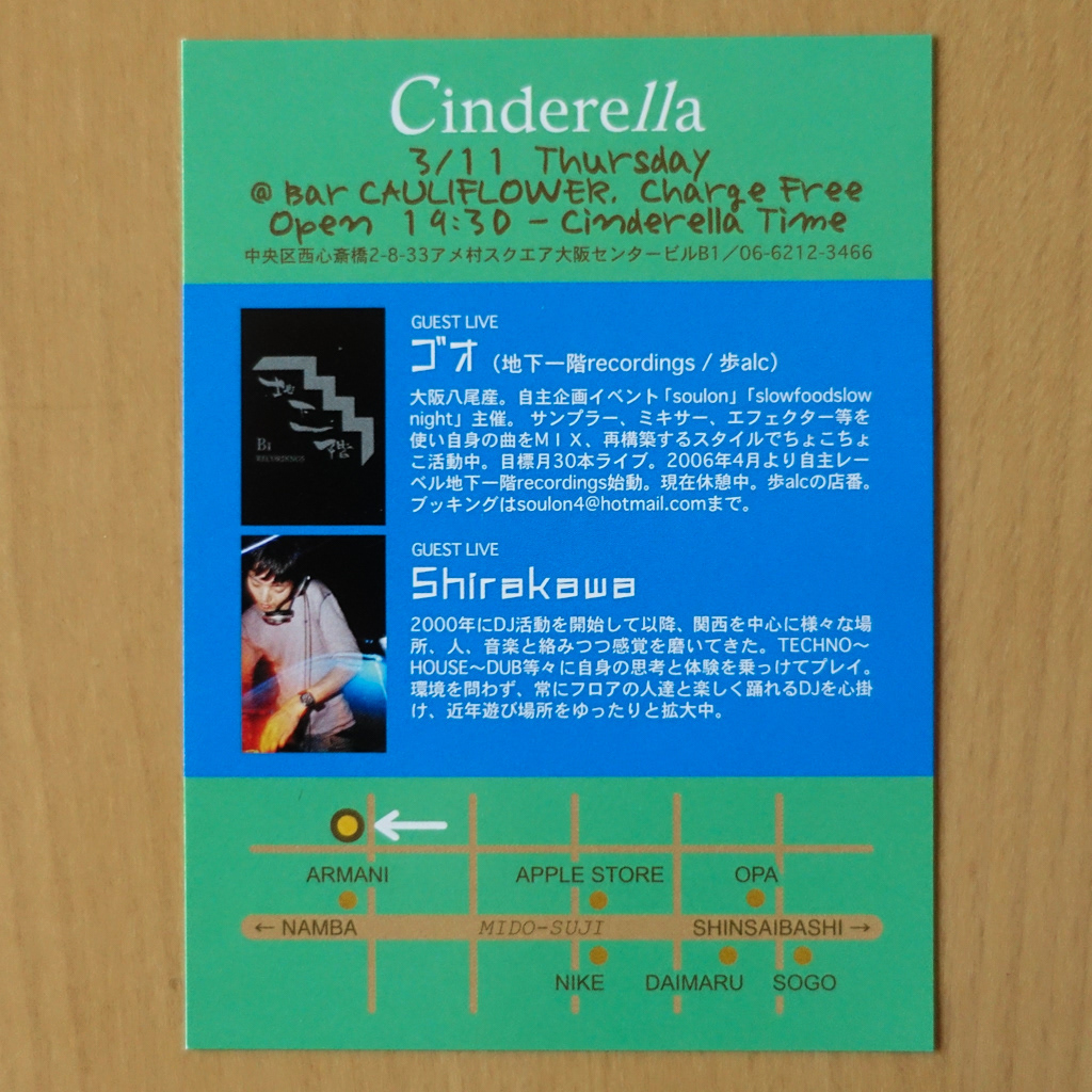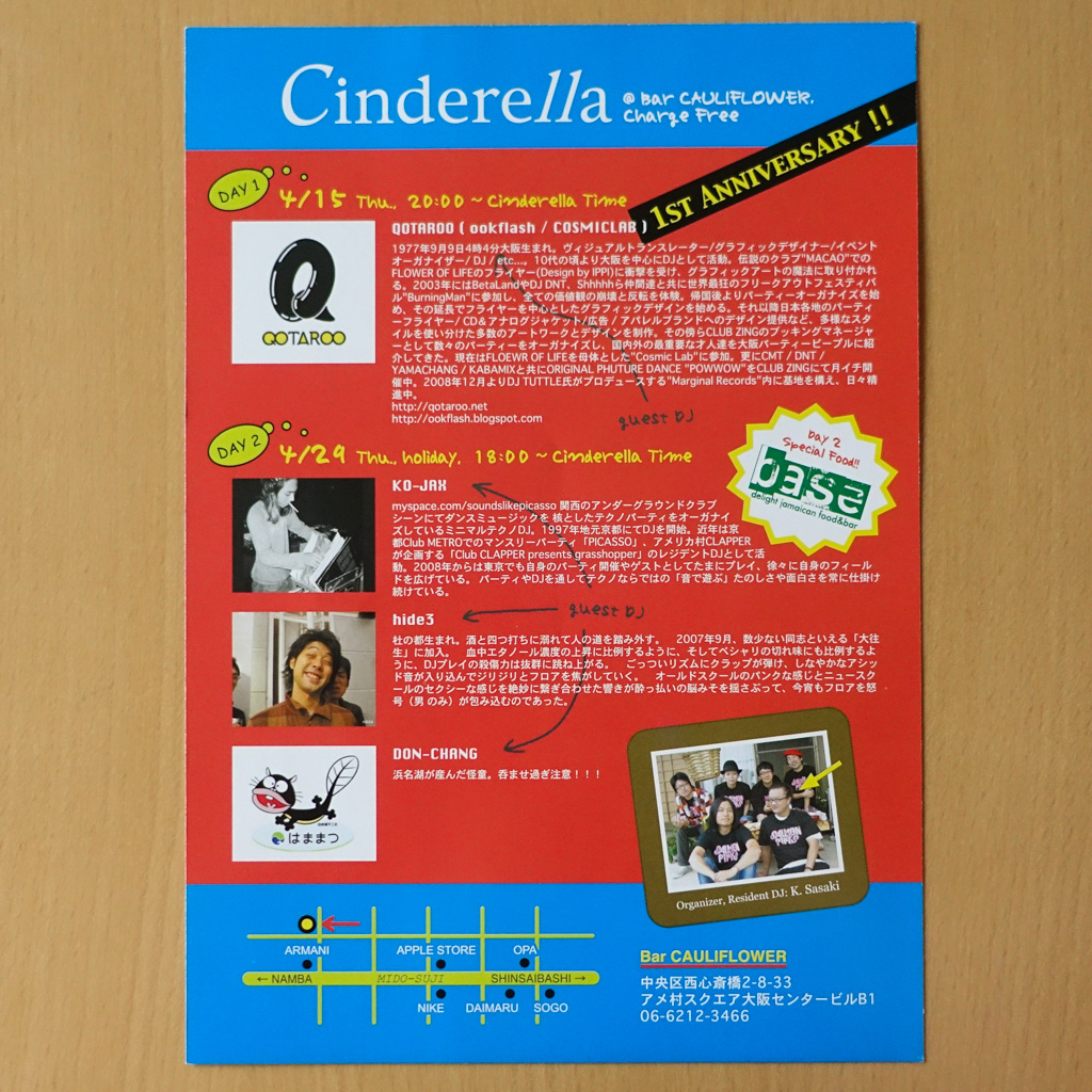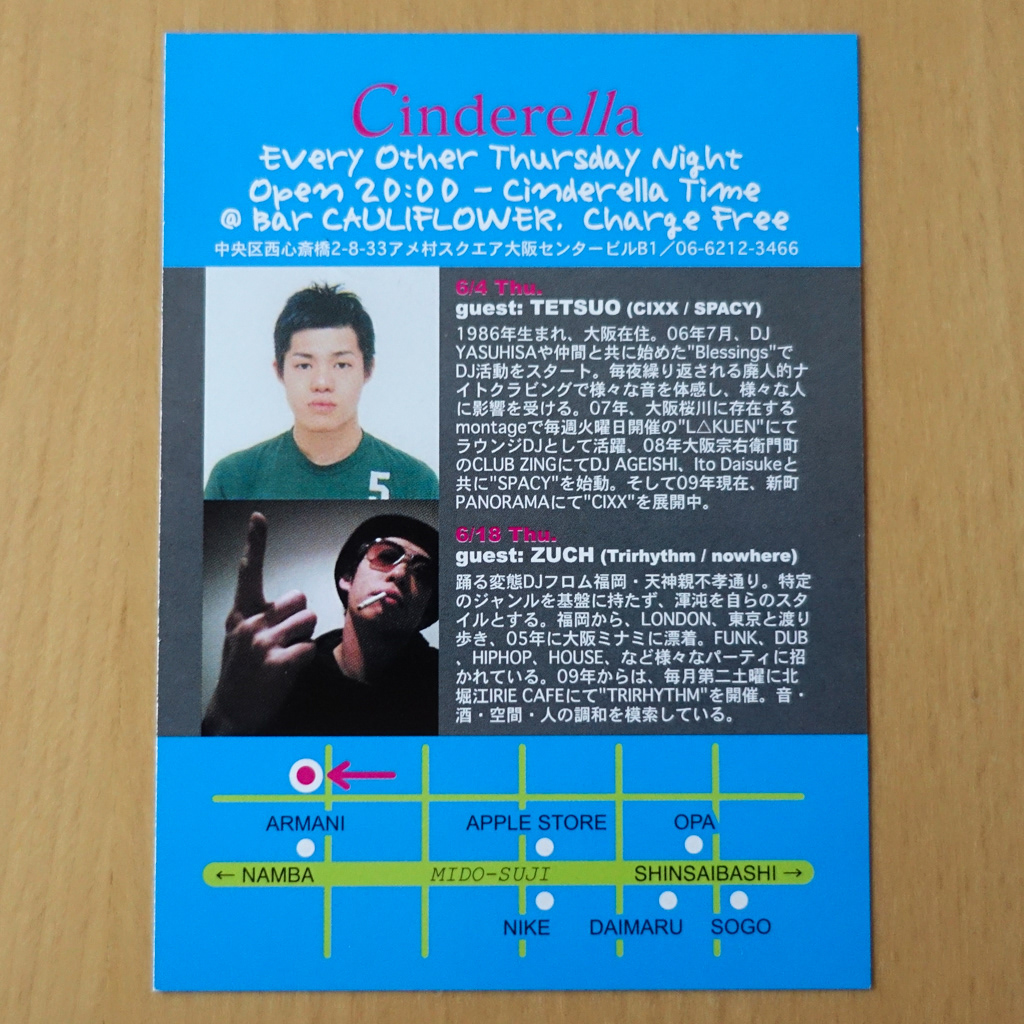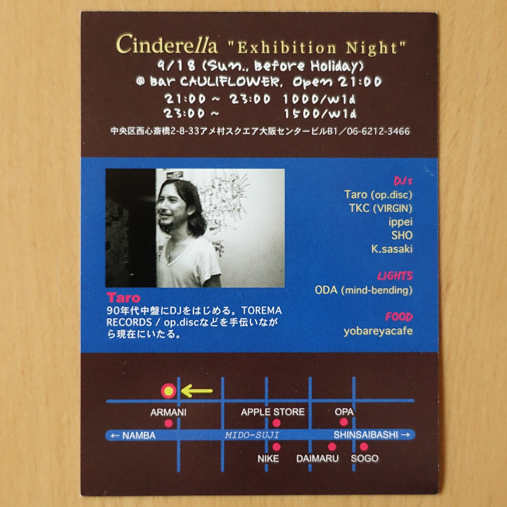 大阪・心斎橋のDJバー「Cauliflower」にて毎月開催されていたパーティ「Cinderella」のフライヤー。