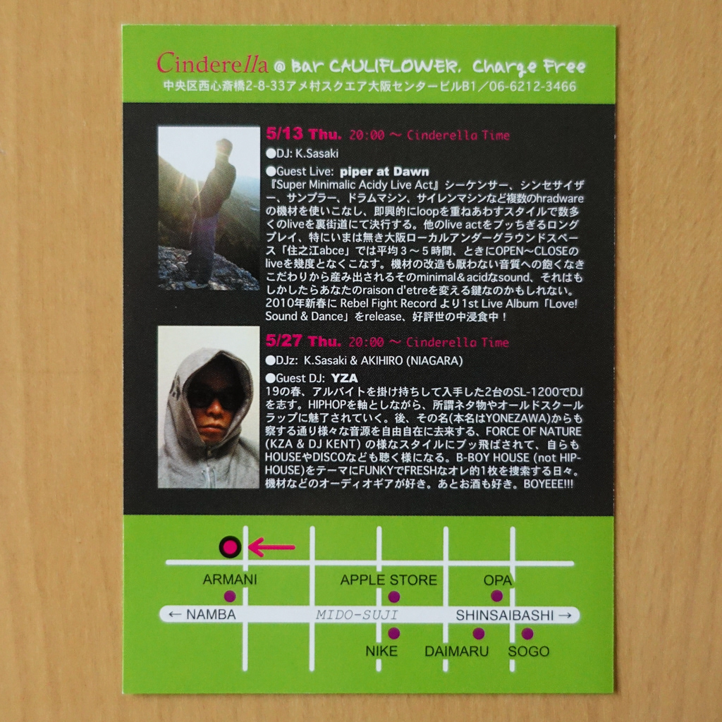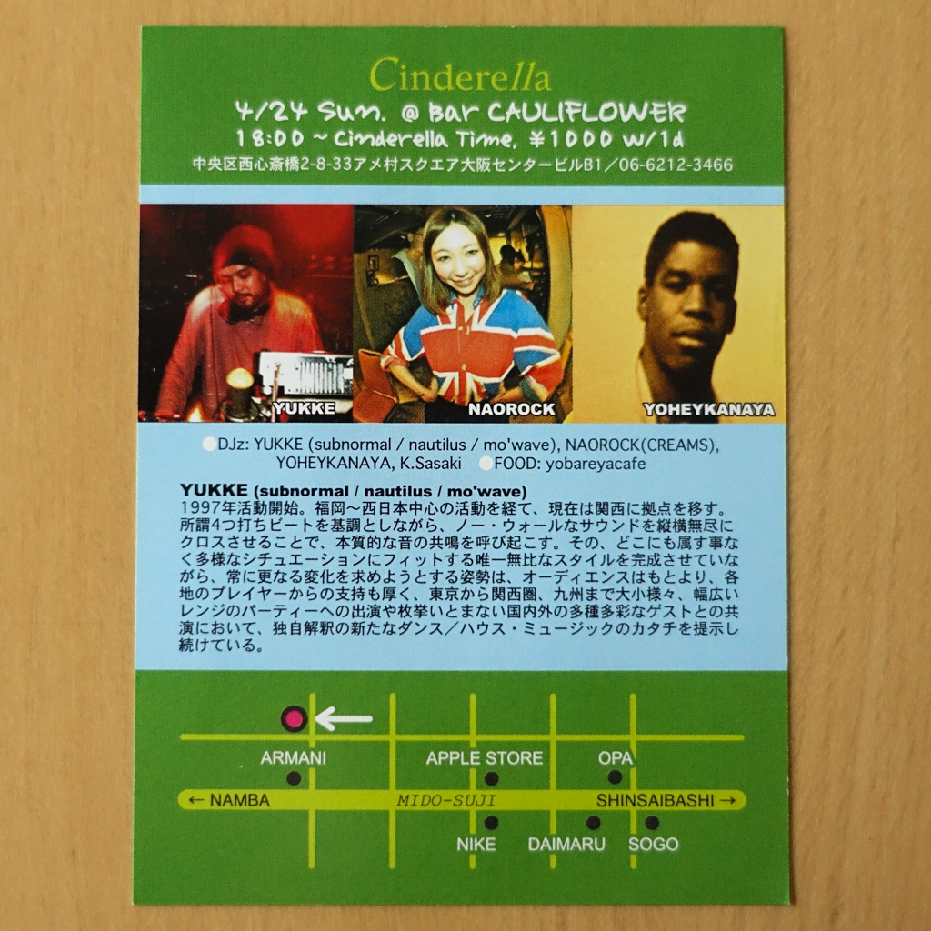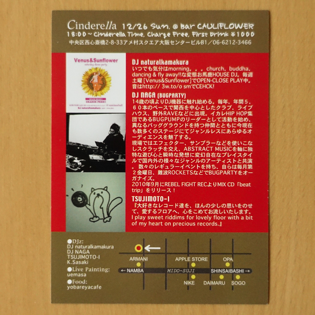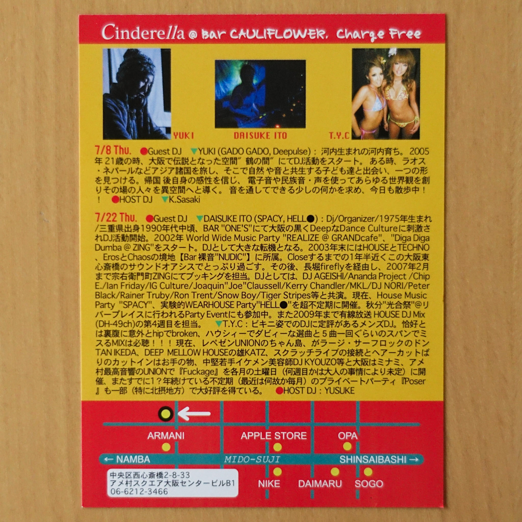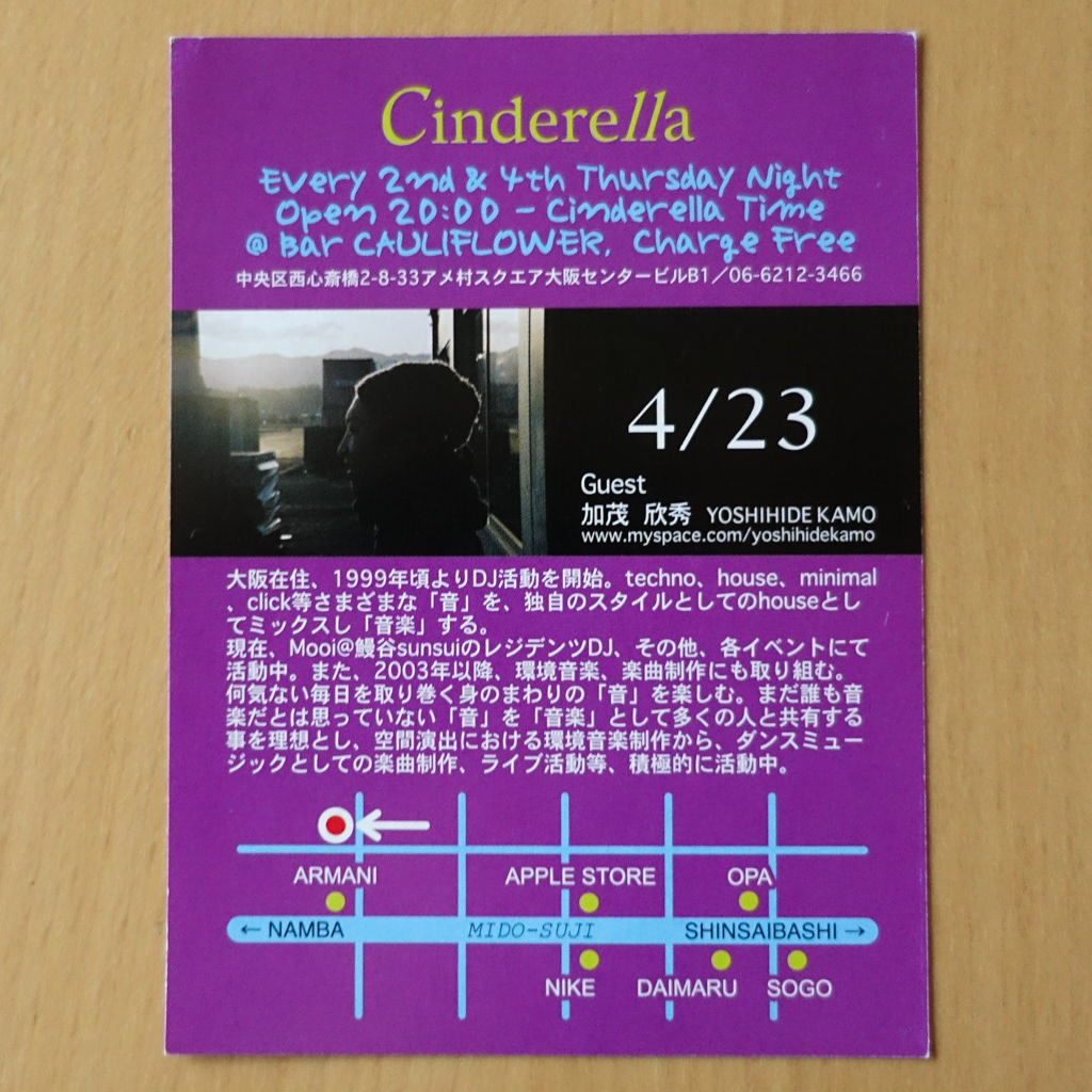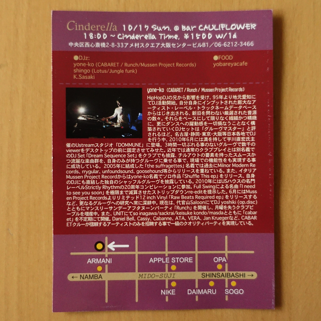 大阪・心斎橋のDJバー「Cauliflower」にて毎月開催されていたパーティ「Cinderella」のフライヤー。