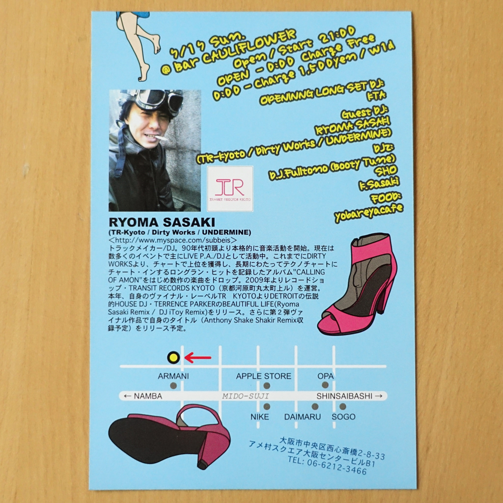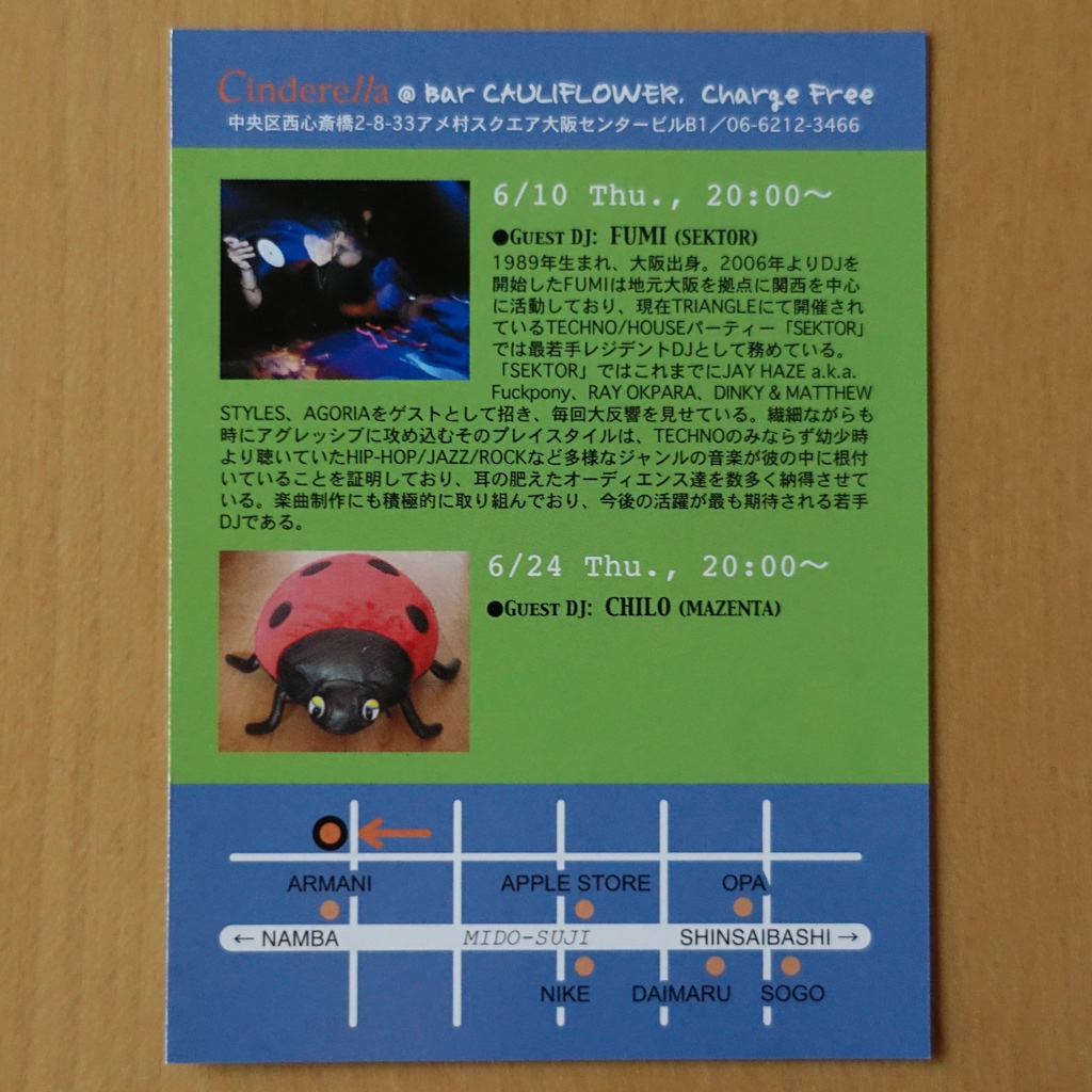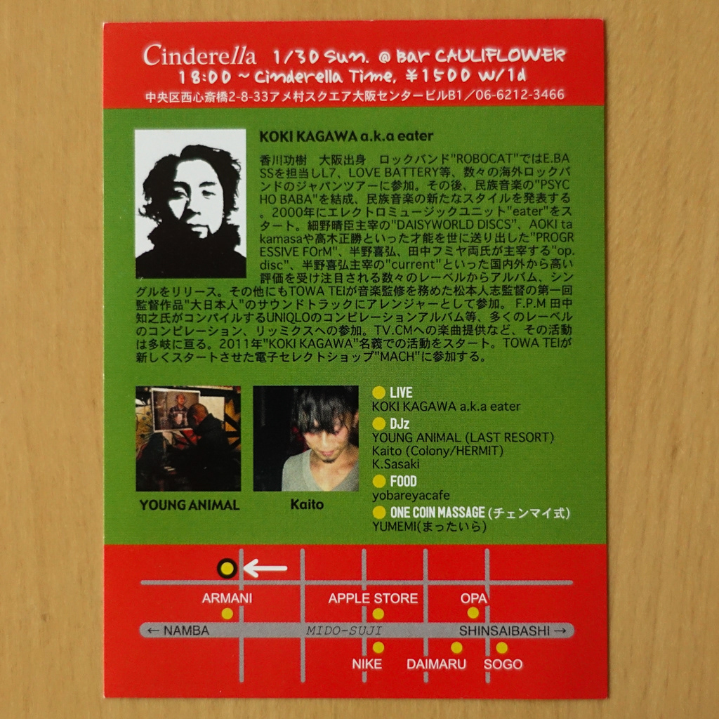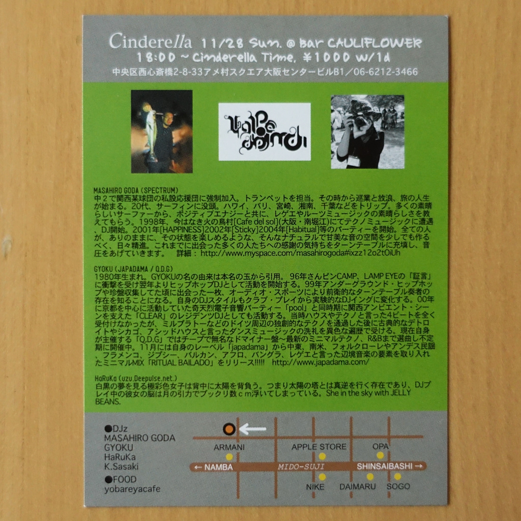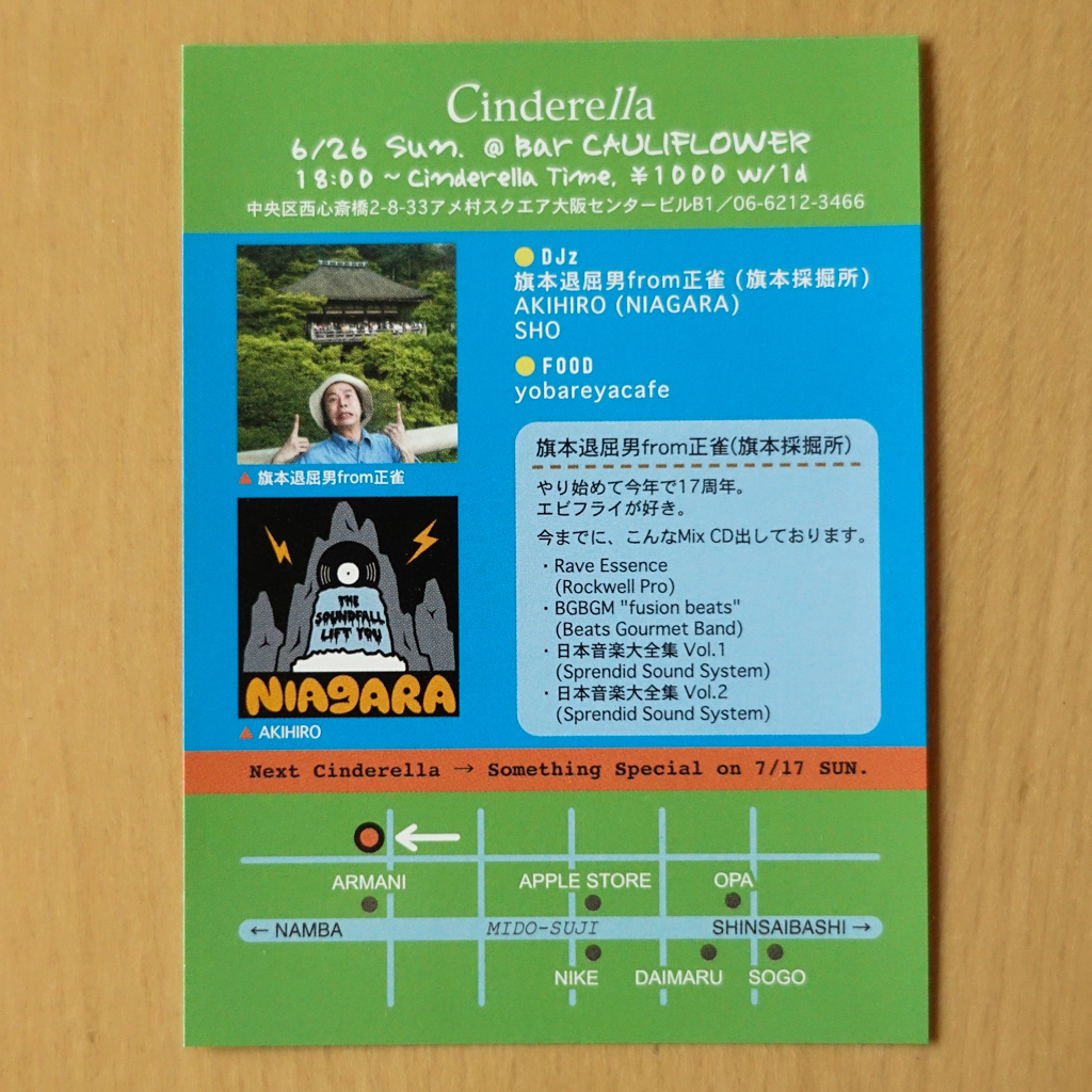 大阪・心斎橋のDJバー「Cauliflower」にて毎月開催されていたパーティ「Cinderella」のフライヤー。